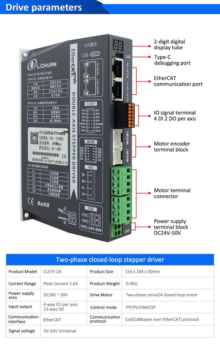 EtherCAT 2Phase Nema24 Bộ điều khiển động cơ bước vòng kín 4 trục DCSản phẩm mới EtherCAT 2Phase Nema24 Bộ điều khiển động cơ bước vòng kín 2 trục DC được sản xuất tại Trung Quốc với CE/ROHS từ LICHUAN®. Nhà máy của chúng tôi là nhà sản xuất và nhà cung cấp Bộ điều khiển động cơ bước vòng kín 2 trục EtherCAT 2Phase Nema24 nổi tiếng ở Trung Quốc. Sản phẩm của chúng tôi có chất lượng cao/bền/hoạt động ổn định và giá thành rẻ. Và chúng tôi cung cấp dịch vụ tùy chỉnh.